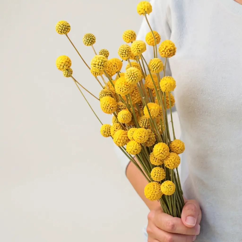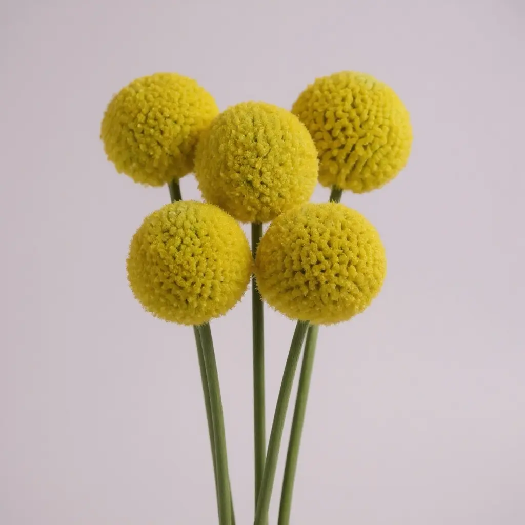 Las Craspedias, también llamadas Billy Buttons, son pequeñas esferas amarillas que aportan textura y un estilo moderno a cualquier arreglo floral. Son altamente resistentes y pueden usarse tanto frescas como secas.